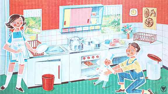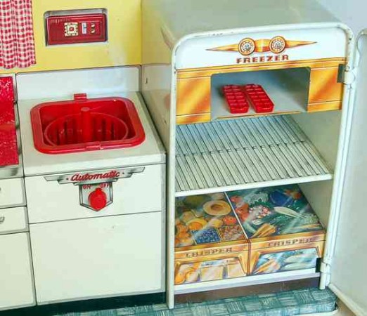 „Leicht verderbliche“ Essensvorräte finden ihren Platz im Kühlschrank und nach beendeter Mahlzeit kann das schmutzige Geschirr im durch einen Mini-Boiler mit Wasser befüllbaren Spülbecken abgewaschen werden. Auf einigen der kleinen Warmwasserbereiter findet sich Firmenlogos damals marktführenden Hersteller „echter“ Boiler – ein Beispiel für Product-Placement und den Versuch frühzeitiger Markenbindung im Kinderzimmer.