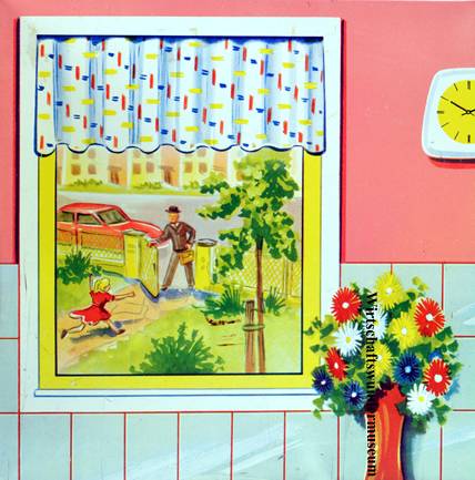 Bei Fuchs fällt der Blick des aufmerksamen Betrachters auf ein kleines Mädchen, das freudig seinen offensichtlich gerade von der Arbeit heimkehrenden Vater begrüßt. Auf der gegenüberliegenden Straßenseite ist eine geschlossene Reihenhausfront erkennbar, im Vorgarten stützt ein Pflock einen frisch gepflanzten Baum. Bezieht man das am Straßenrand geparkte und aufgrund seiner Größe der gehobenen Mittelklasse zuzuordnende Auto in seine Betrachtungen mit ein, ergibt sich als Gesamteindruck das Bild einer jungen Familie, die es bereits „zu etwas gebracht hat“ und sich ein Eigenheim in der Stadtrandsiedlung, einen PKW sowie eine moderne Einbauküche leisten kann.