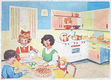 Die Grundrisse der neu gebauten Wohnungen werden mittlerweile wieder großzügiger bemessen und das Maß aller Dinge bilden Küchen mit integrierter Sitz- und Essecke, die durch einen halbhohen Raumteiler vom Arbeitsbereich abgegrenzt wird. Auf diese Weise „werden viele Wege beim Anrichten und Abräumen gespart; die dort spielenden Kinder bleiben unter Aufsicht und die Hausfrau wird angeregt, sich einige Minuten der Entspannung zu gönnen“ (Küchenfibel).