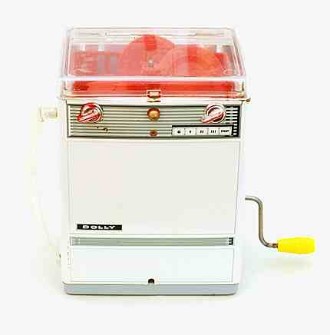 Ebenfalls selten ist eine Geschirrspülmaschine von Seidel. Zweisprachige Packungsbeschriftung in Deutsch und Englisch sowie die Typenbezeichnung „Dolly“ sprechen dafür, dass sie insbesondere für den Export hergestellt wurde.