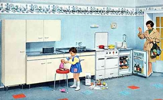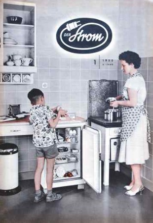Verfügten 1953 erst 9 Prozent aller Haushalte über ein solches Gerät, waren es 1963 bereits 52 Prozent. Der Kühlschrank vereinfacht die Haushaltsführung enorm und verändert den kompletten Tagesablauf der Hausfrau. Musste sie zuvor nahezu täglich einkaufen gehen, wenn sie ihrer Familie frische Produkte auf den Tisch bringen wollte, kann sie nun auch in Bezug auf leichtverderbliche Lebensmittel Vorratshaltung betreiben.