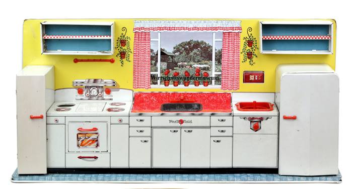 Nichtsdestotrotz lassen sich die arbeitserleichternden Vorzüge dieser bis ins Detail durchdachten Reformküche nicht verleugnen und so fordert 1954 der „Führer durch die gesamte Küche und Hauswirtschaft“ eine durchdachte Modernisierung des „Reiches der Frau“: „Da in den meisten Fällen die Küchenarbeit und ihr äußerlicher Rahmen entweder ganz nach Mutters Rezept übernommen wurde oder sich im Laufe der Jahre eine Reihe feststehender Gewohnheiten herausgebildet hat, sind viele Möglichkeiten vorhanden, neuzeitliche Veränderungen vorzunehmen.“ Veränderungen, die auch im vielfältigen Blechküchenangebot der Spielzeughersteller ihre Entsprechung finden.