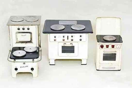 Doch zurück zu den Spielzeugen: Ob sie die Miniaturausgaben von Gas- oder von Elektroherden darstellen sollen, lässt sich nicht immer mit Sicherheit bestimmen. Während ein Kohleherd drei charakteristische Schubfächer besitzt, jeweils für das Nachlegen des Brennmaterials, die Entsorgung der Asche sowie für den Kohlevorrat, sind sich diese beiden alternativen Systeme im äußeren Erscheinungsbild sehr ähnlich.