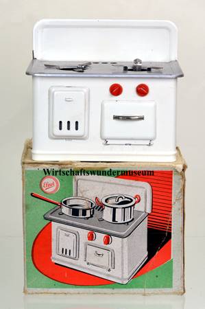 Doch zurück zu den Spielzeugen: Ob sie die Miniaturausgaben von Gas- oder von Elektroherden darstellen sollen, lässt sich nicht immer mit Sicherheit bestimmen. Während ein Kohleherd drei charakteristische Schubfächer besitzt, jeweils für das Nachlegen des Brennmaterials, die Entsorgung der Asche sowie für den Kohlevorrat, sind sich diese beiden alternativen Systeme im äußeren Erscheinungsbild sehr ähnlich.