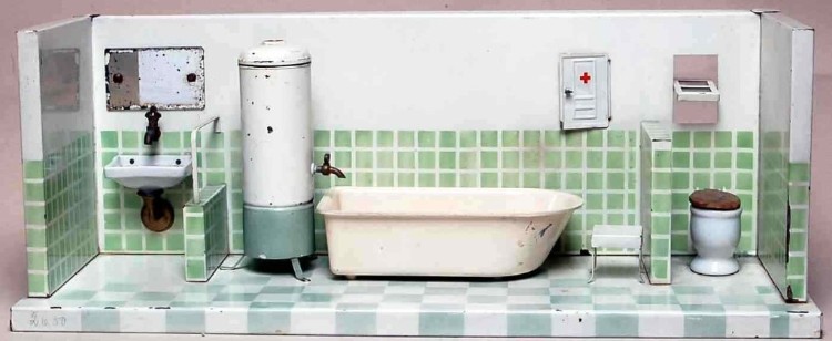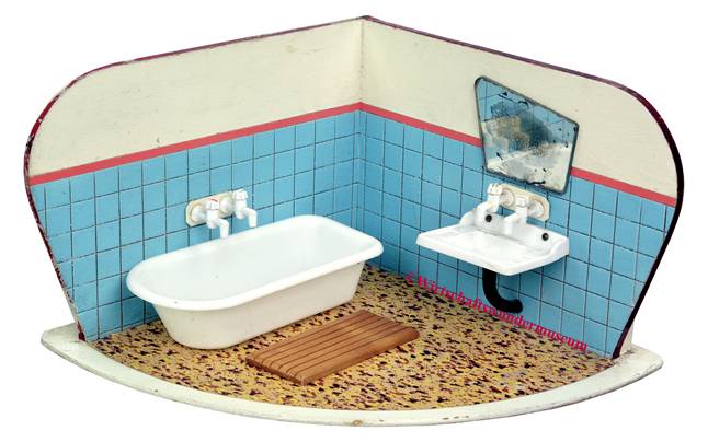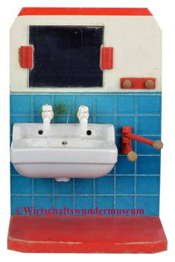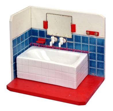 Blechbad „Made in Western Germany“, 35 x 10 x 13 cm, 1962 angeboten im Quelle-Versandhauskatalog: „Puppen-Badezimmer, Badeofen und Hahn am Waschbecken geben Wasser durch Druckvorrichtung, mit Pumpe, Eimer und Handtuch; ca.35 cm lang. In herrlichen Farben lithographiert, ein reizendes Spielzeug. DM 4,95.-„