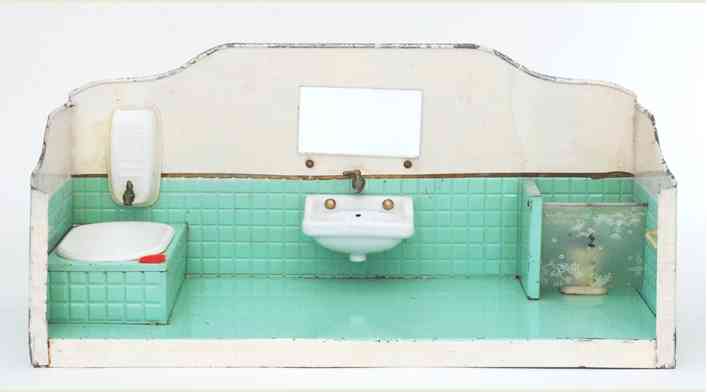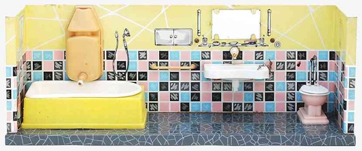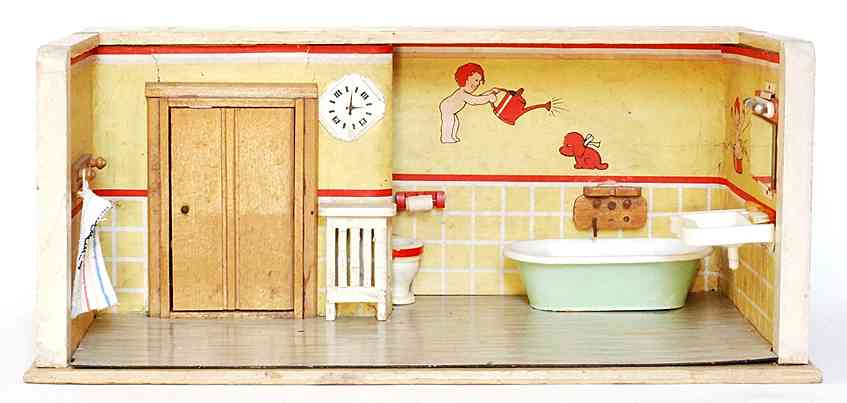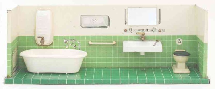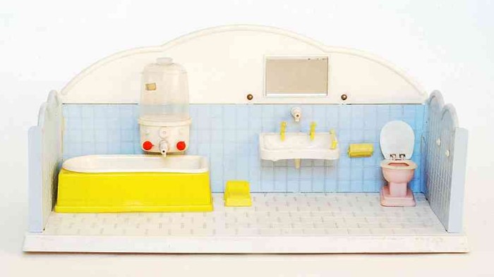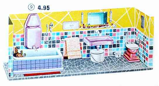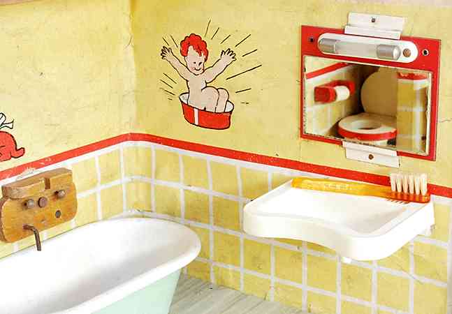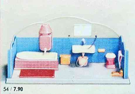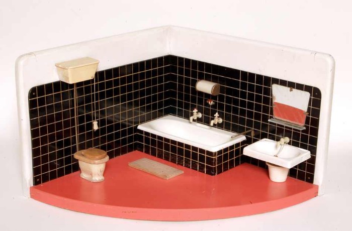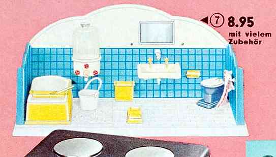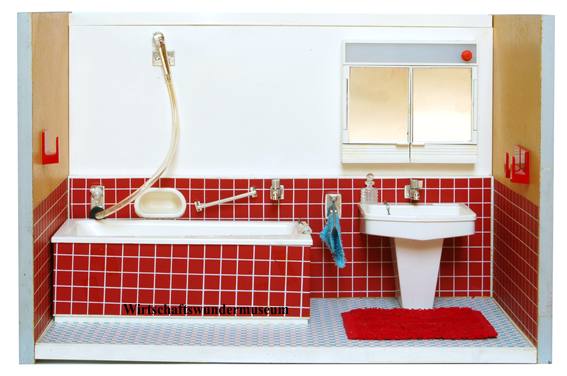 Holz-Badezimmer des Herstellers Linus Dähnert, DDR. Es wurden auch noch Varianten mit gelben, bzw. grünen Kacheln angeboten. – Das Werbefoto für ein „echtes“ Badezimmer aus dem Jahr 1959 zeigt, wie anschaulich dieses Spielzeug den damaligen Zeitgeschmack widerspiegelt.