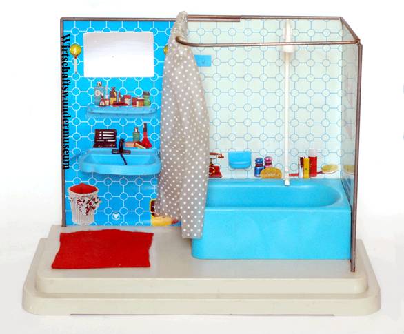 „Bade-Dusche und Wasserbecken, beide mit fließendem Wasser, durch elektrische Pumpe bedient, für Puppen bis zu 22 cm, Wände aus lithografiertem Blech, alles andere Kunststoff, Größe 42 x 18 x 31 cm. Hersteller: Martin Fuchs Metallwarenfabrik“ (aus einem Anzeigentext von 1964). – Auf dem rechten Bild nochmal das gleiche Grundmodell, jedoch in einem geradezu psychedelisch anmutenden 70er-Jahre-Flower-Power-Design.