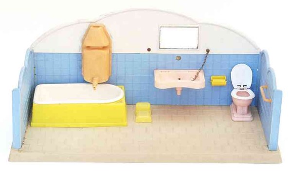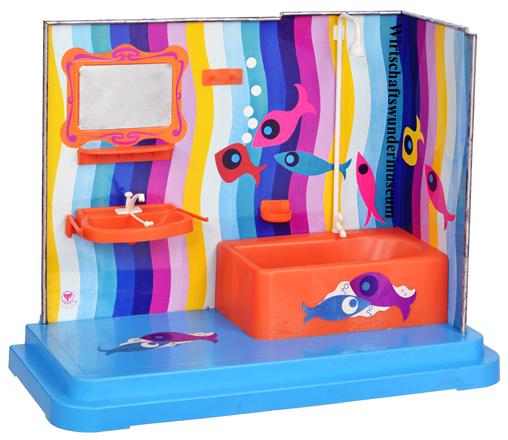 Ein Badezimmer der 70er Jahre von der Crailsheimer Spielwarenfabrik aus pflegeleichtem Kunststoff. Clou ist ein Spiegelschrank mit Beleuchtung! Wie in nahezu allen „echten“ Badezimmern darf dieses Badmöbel natürlich auch im spielgerechten Miniaturformat nicht fehlen. Aus einem zeitgenössischen Werbetext: „Immer mehr echte Funktion wird von Spielmöbeln verlangt. Deshalb wurde bei der Erweiterung des „Spielprogramms GABI“ der Crailsheimer Spielwarenfabrik auf einen hohen Spielwert geachtet. Das neue Badezimmer funktioniert originalgetreu. Durch einen in die Rückwand eingebauten Wasserbehälter kann die Badewanne gefüllt, die Dusche und das Waschbecken versorgt werden. Der geräumige Toilettenschrank ist beleuchtet.“ Maße: 46 x 24 x 31 cm.