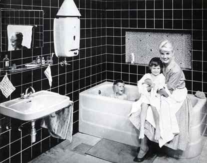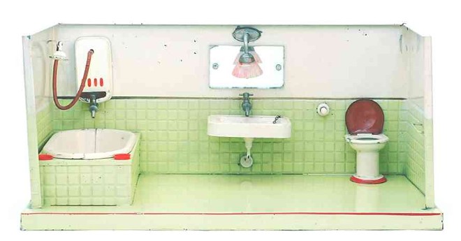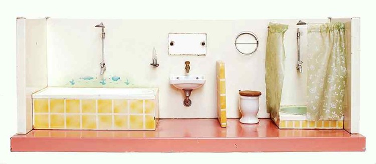 Auch die Modernisierung der deutschen Badezimmer findet ihre Entsprechung in der Puppenhauswelt, hier sehr anschaulich dokumentiert durch Bäder der Firmen Kibri. Während beim oberen Modell zur Warmwasserbereitung noch ein monströser Boiler benötigt wird, kommt das fließend warme Wasser beim unteren Bad dank Zentralheizung schon direkt „aus der Wand“. Hochmodern auch die Dusche samt Duschvorhang aus Plastik. Beide Spielzeuge sind durch an der Rückseite angebrachte Wassertanks und funktionierende Armaturen realitätsnah bespielbar – und deshalb auch recht selten ohne größere Roststellen zu finden.