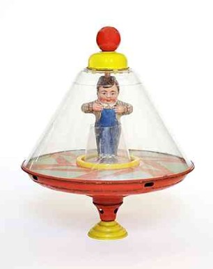 Ein schlichter Brummkreisel und ein „Hula-Hoop-Kreisel“ – In Drehung versetzt, rotiert bei diesem Spielzeug der Firma Fuchs der gelbe Ring um die Hüfte des Blechmännchens. Höhe ca. 28cm