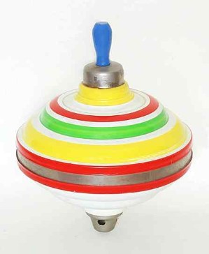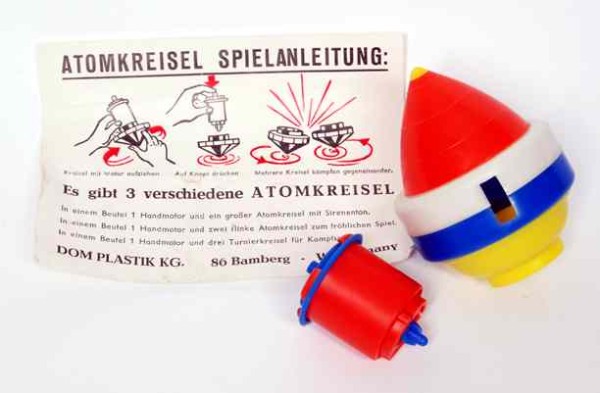 Stundenlanger Spielspaß ganz ohne Hightech: Kreisel, hier „Peitschenkreisel“ der 50er Jahre, die durch eine herumgewickelte und schnell weggezogene Peitschenschnur in Rotation gesetzt werden und durch geschickte Peitschenschläge in Bewegung gehalten werden können.