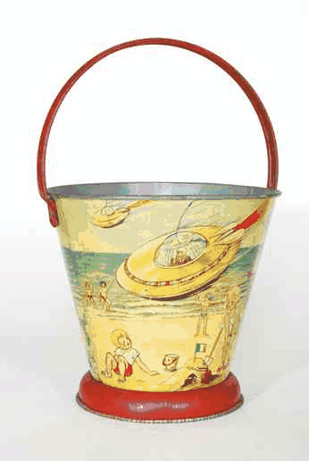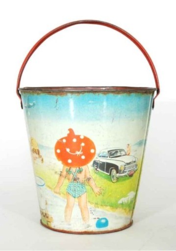 Zwei farbenfroh lithografierte Sandeimer aus Blech. Oben mit einer Abbildung des ab 1949 gebauten Borgward Hansa 1500 (der ersten westdeutschen PKW – Neuproduktion nach dem Krieg) und damit ein frühes Beispiel für Product-Placement im Kinderzimmer. Das Motiv dokumentiert, dass sich die Lage nach der Währungsreform zumindest ein Stück weit zu normalisieren beginnt und es einem Teil der Deutschen materiell wieder besser geht. –Rechts ein Blecheimer mit recht skurrilem Fliegende-Untertassen-Motiv. Spielzeuge dieser Art sind, da zumeist verrostet, nur noch sehr selten zu finden. Maße: Höhe mit Henkel jeweils ca. 25 cm.