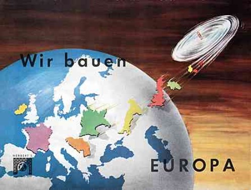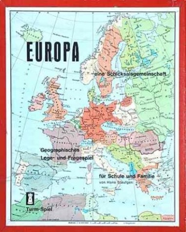 Alte Spiele mit hochaktuellen Titeln: Das Puzzle/Legespiel „Wir bauen Europa“ (HERBERT’S geographische Spiele) sowie „Europa, eine Schicksalsgemeinschaft“, „Ein erdkundliches Lege- und Fragespiel für Familie und Schule“, Turm Spiele, 1957. „Die Technik hat das Leben des Menschen und das Gesicht der Erde in den letzten zwei Jahrhunderten stark verändert (…) Der Begriff von Raum und Zeit änderte sich grundlegend. In wenigen Stunden werden Kontinente überwunden. Der Mensch von heute ist kaum in der Lage, dieser Entwicklung geistig zu folgen. (…) Mit der Technisierung bildeten sich große Wirtschaftsräume und Staaten. (…) Europa, der alte Erdteil (…) wurde von der allgemeinen Entwicklung in der Welt überrundet. Seine führende Rolle hat es eingebüßt. USA und Sowjet-Union bestimmen gegenwärtig das Geschehen auf unserem Planeten. – Den Blick auf die politischen Gegebenheiten zu öffnen, das Wissen um Europa zu vertiefen und den Gedanken zu stärken, dass die europäischen Staaten sich auf vielen Lebensgebieten enger zusammenschließen müssen, um sich ihre Eigenart zu erhalten und die Aufgabe in der Zeit zu meistern, ist der Zweck dieses Spiels.“