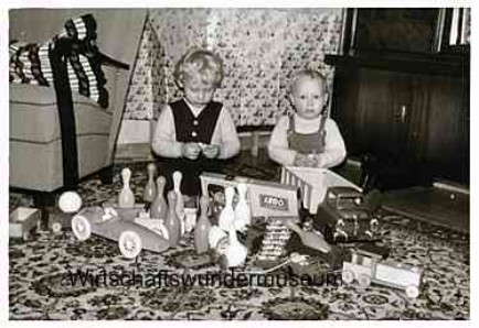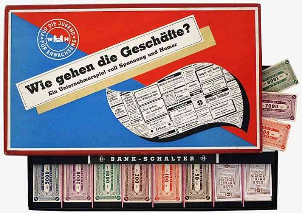 Für mich persönlich DAS Gesellschaftsspiel / Brettspiel schlechthin zum Thema „Wirtschaftswunder“: „Wie gehen die Geschäfte?“ – „Ein Unternehmerspiel voll Spannung und Humor“ von „Haus Hachenburg, Abt. Spiele Verlag, Bremen“, für „einen Jungen oder Mädel vom 12. Lebensjahre an“. Aus dem Begleitheft: „Wohl alle Menschen möchten zu Geld und Besitz kommen. Je früher, desto besser (…) Man lernt bei diesem Spiel für das praktische Leben manches hinzu. Denn auch ohne unbedingt ein Geschäfts-Unternehmer zu sein oder werden zu wollen, lohnt es sich immer, diesen oder jenen Geschäfts-Vorteil kennenzulernen, mit dem man Geld verdient. Denn es dreht sich vieles im Leben bekanntlich um das liebe Geld: Und so können die Spieler Eigentümer von Geschäften werden, deren Wert sich – nach dem Monopoly-Prinzip – im Verlauf des Spielbrettes stetig steigert. Preislich ganz unten angesiedelt sind ein „Milchgeschäft“ und ein „Konfitüren-Geschäft“, im mittleren Segment ist eine“Leihbücherei“ zu finden und am wertvollsten ist – zeittypisch – ein „Baugeschäft“.