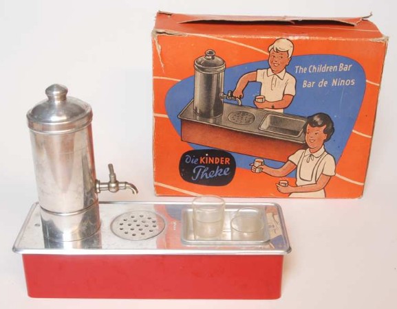 „Die Kindertheke“ – eine Art Puppenküche für Jungen aus dem Jahr 1955. Aussagekräftiges Zeugnis einer Zeit, in der Suchtvorbeugung/-verhütung noch ein Fremdwort war und das Trinken von Alkohol zum guten Ton gehörte. Theke: 18 x 14 x 7 cm, Hersteller: Hesmer & Möllhoff Metallwarenfabrik, Werdohl-Bärenstein/Westfalen