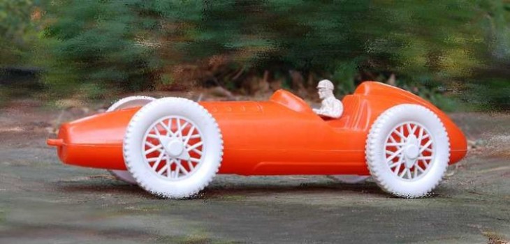 Eines der ersten Plastikspielzeuge aus den frühen 1950er Jahren,  mit Fahrerfigur aus Masse, gemarkt „Progress Werk“ (Progresswerk Nürnberg). Später gab es wohl noch ein baugleiches Modell von Geobra mit modifiziertem Fahrer. Auf den Michelin-Reifen des sehr detaillierten Mercedes Rennwagen-Modells ist sogar deren Größe zu erkennen (6.40 – 13X), die Gesamtlänge des Spielzeugs misst stattliche 39 cm.