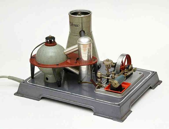Wer glaubt, dass es ein Spielzeug-Atomkraftwerk nur im berühmten Weihnachtssketch von Loriot gibt, wird hier eines Besseren belehrt. Die kuriose, paradoxerweise elektrisch betriebene Wilesco Dampfmaschine R 200 „Atomkraftwerk“ dokumentiert den Fortschrittsglauben, aber auch die Ängste dieser Zeit. Aus der Betriebsanleitung: „Lieber junger Freund! Ein neues technisches Zeitalter ist angebrochen – das des Atoms. Noch stehen wir am Anfang dieser Epoche. Du wirst groß mit dieser Zeit, und Worte wie Kernspaltung, Kettenreaktion und Radioaktivität sind für dich schon geläufige Begriffe geworden. Du wirst alle diese Dinge mehr von der technischen Seite her betrachten als die ältere Generation, wie vielleicht auch deine Eltern. Bei ihnen hat allein schon das Wort „Atom“ einen bitteren Beigeschmack, denn nur allzu oft wird es in Verbindung gebracht mit „Atombombe“, mit Tod und Vernichtung.“